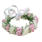 * זר לראש ליזי ורוד, חרצית לבנה וגיבסנית לבנה.