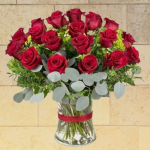 ** זר ורדים אדומים גבוהים, ירק, גיבסנית, ענפי קישוט, אלמנטים ואריזה אלגנטית.