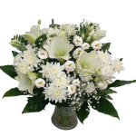 ** זר פרחים קלאסי לבן – ליזי לבן, שושן צחור, חרצית לבנה, ירק, תוספות ואריזה אלגנטית.