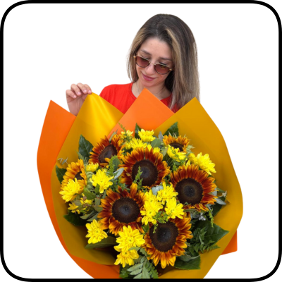 ** זר קיץ – חמניות, חרציות, ירק, מילוי ואריזה יפה לזר.