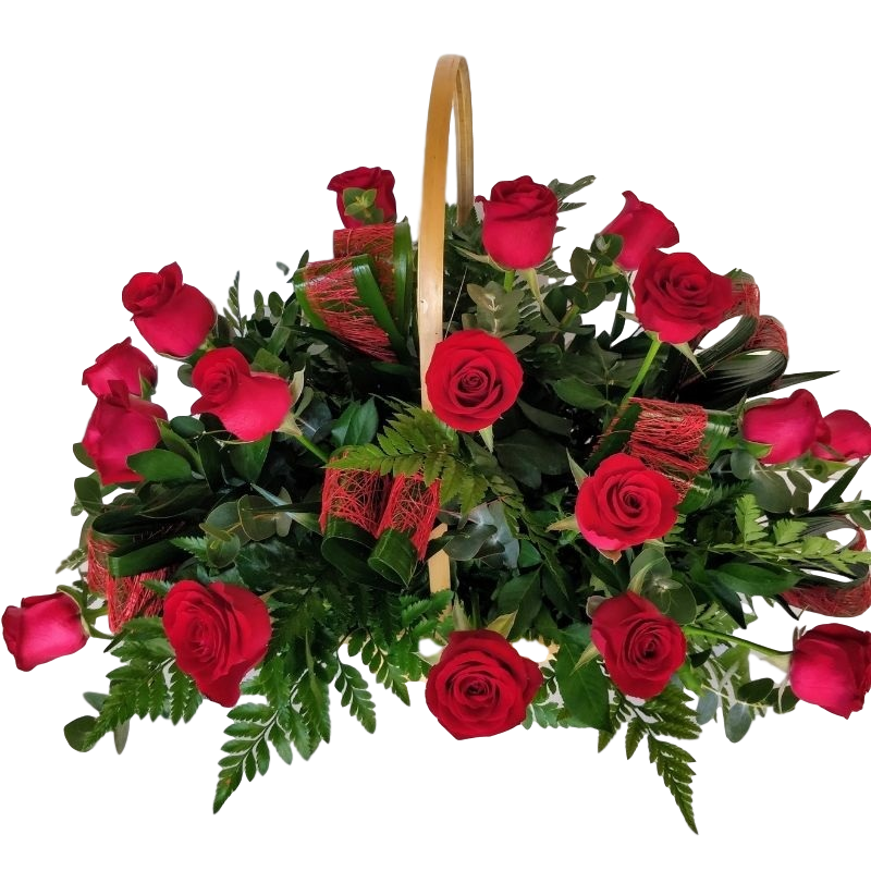 * סידור 21 ורדים איכותיים – Lovely Red, ירק ותוספות בסלסלה.